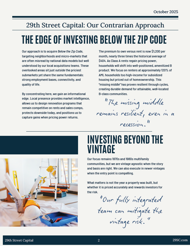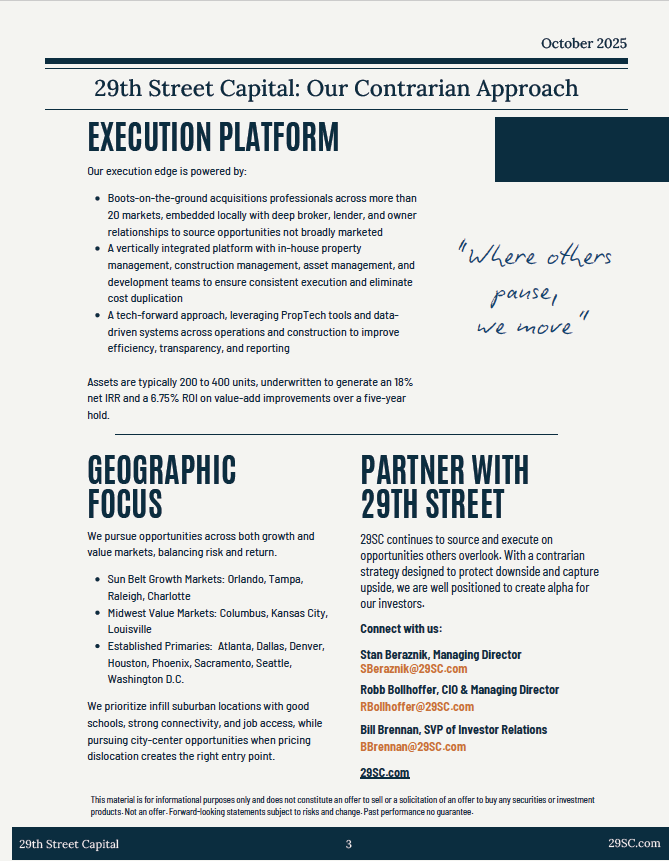 29th Street Capital strives to make positive economic, social, and environmental changes for the local community and real estate markets. At 29th Street Capital, our team of professionals are driven by and follow our strengths bringing the market a multifamily industry-leading company.