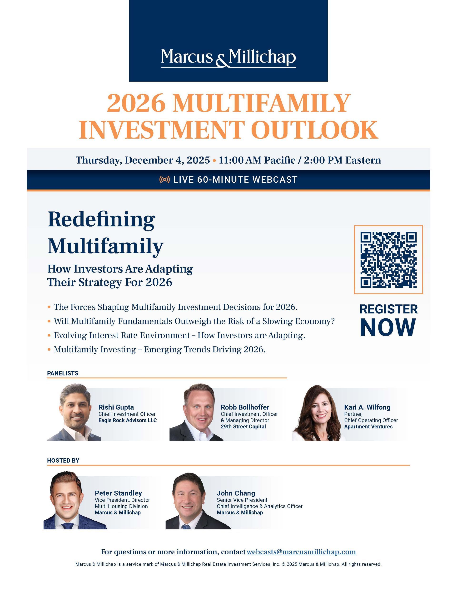 As multifamily investors navigate interest rate uncertainty, inflationary pressure, and evolving renter trends, strategic clarity has never been more critical. On Thursday, December 4, 29th Street Capital’s Chief Investment Officer and Managing Director, Robb Bollhoffer, will join a panel of industry leaders for Marcus & Millichap’s virtual event, “2026 Multifamily Investment Outlook: Redefining Multifamily.”